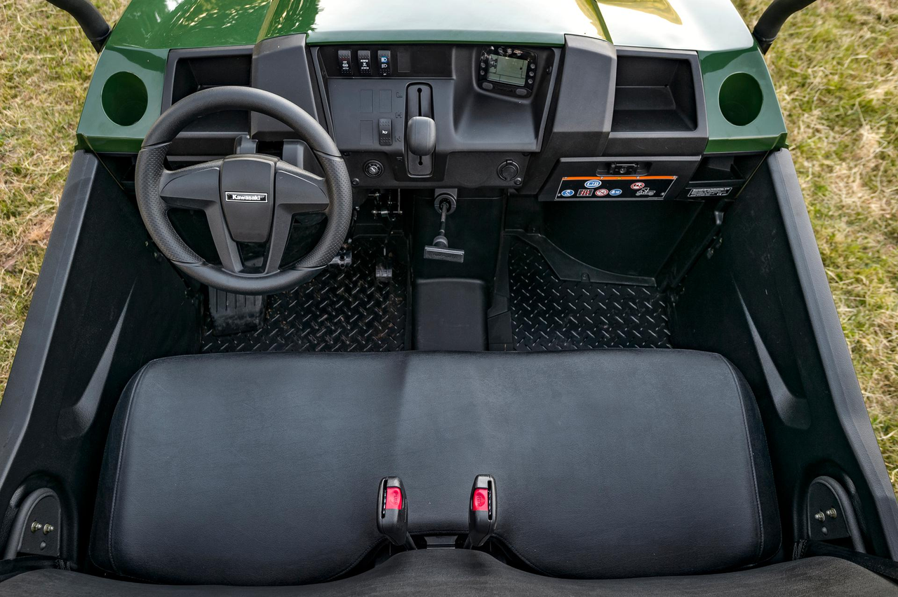 Kawasaki's hoogwaardige elektrische stuurbekrachtiging (EPS) is snelheidsgevoelig en biedt een lichte besturing bij lage snelheid, de bekrachtiging neemt af naarmate de rijsnelheid toeneemt. Het systeem verbetert ook het rijcomfort en de controle door als dempingssysteem te fungeren, waardoor bumpsteering en terugslag op het stuur als gevolg van schokken op de wielen wordt verminderd. Bestuurders kunnen de stand van het kantelbare stuurwiel naar eigen voorkeur instellen en het stuurwiel uit de weg tillen om het in- en uitstappen te vergemakkelijken.