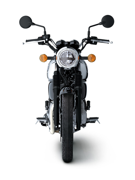 De volle zwarte lak wordt gecombineerd met chromen afwerkingen, wat dit model zijn kenmerkende Meguro-uitstraling geeft, nauw aansluitend bij de modellen uit het verleden.