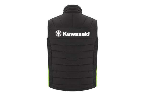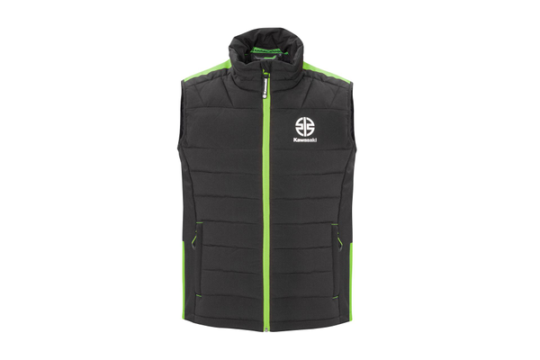 Gewatteerde bodywarmer met binnen- en buitenzakken. Kawasaki-gestikte quilt, groene details, 96% polyester/4% spandex, TPU-membraan WP 8000 mm/BRP 3000 mm.