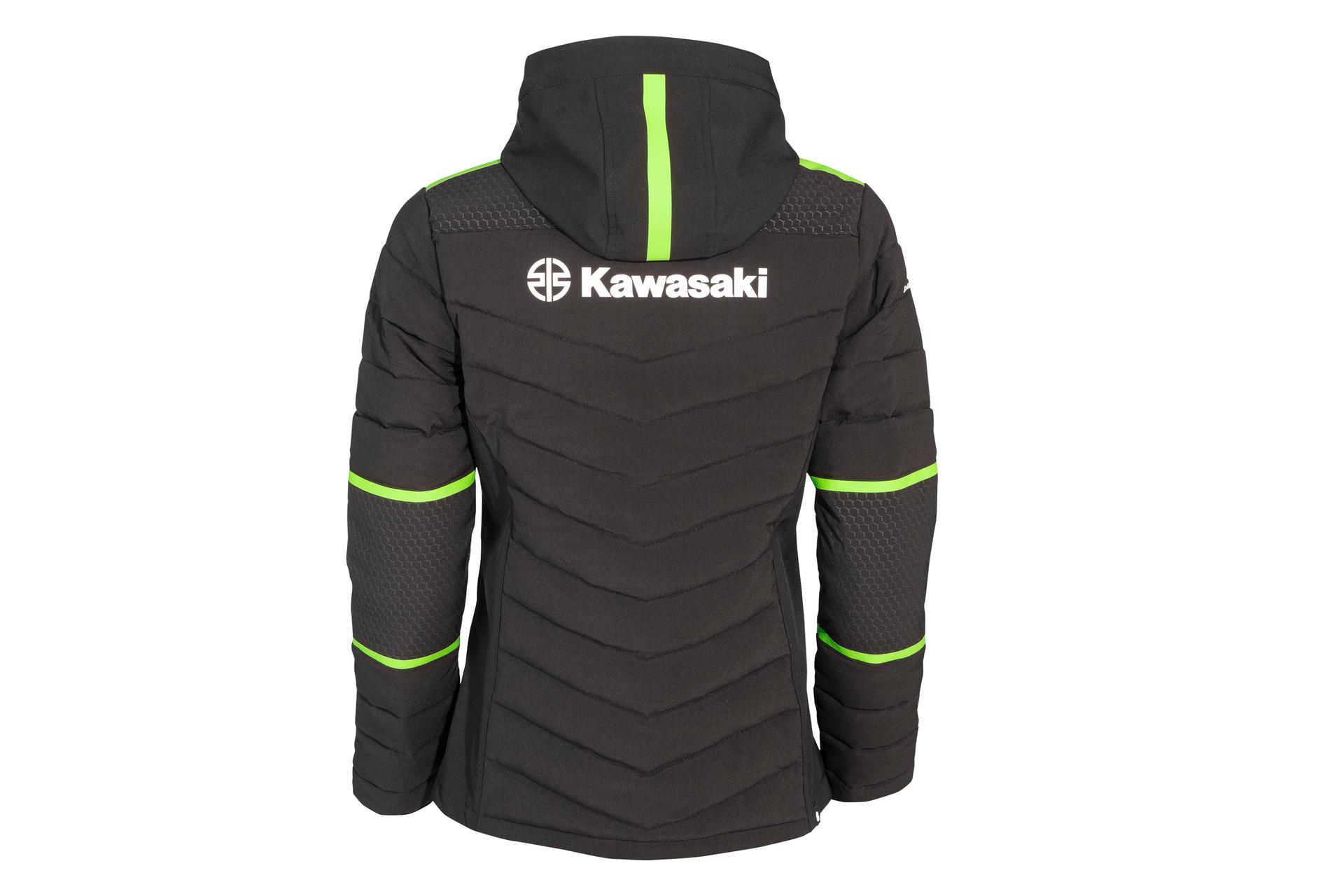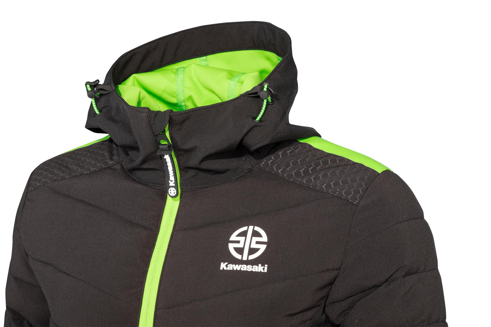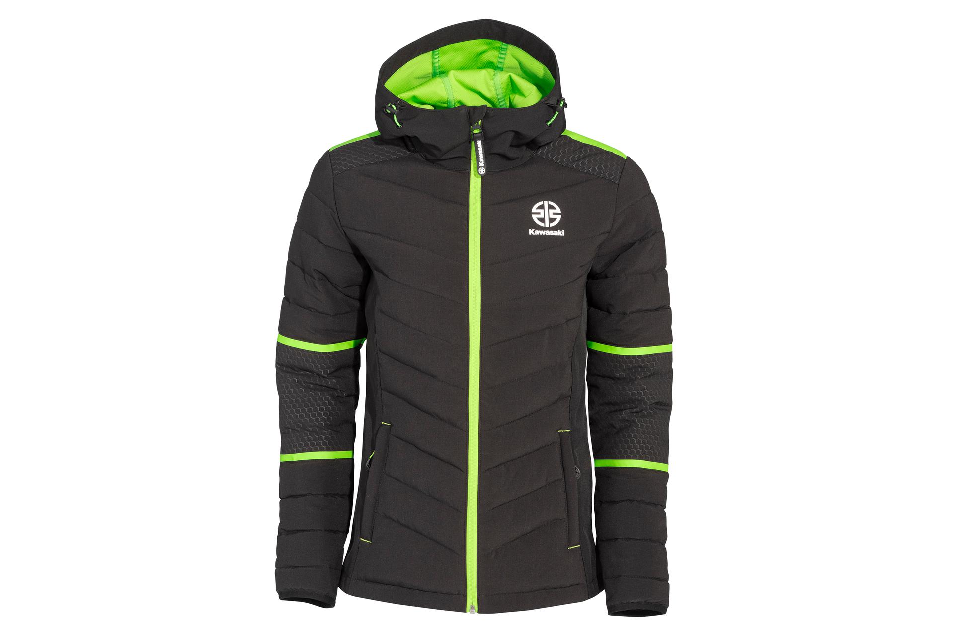 Gewatteerde jas met binnen- en buitenzakken. Kawasaki-quilt, groene voering in capuchon, hexagonprint op schouders/oksels, 96% polyester/4% spandex, TPU-membraan WP 8000 mm/BRP 3000 mm.