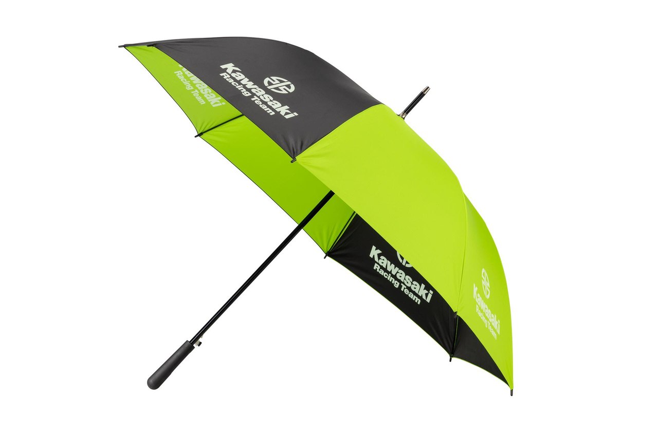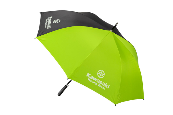 Grote paraplu van 125 cm diameter met contrasterende binnen- en buitenkleur en Kawasaki logo aan beide zijden.