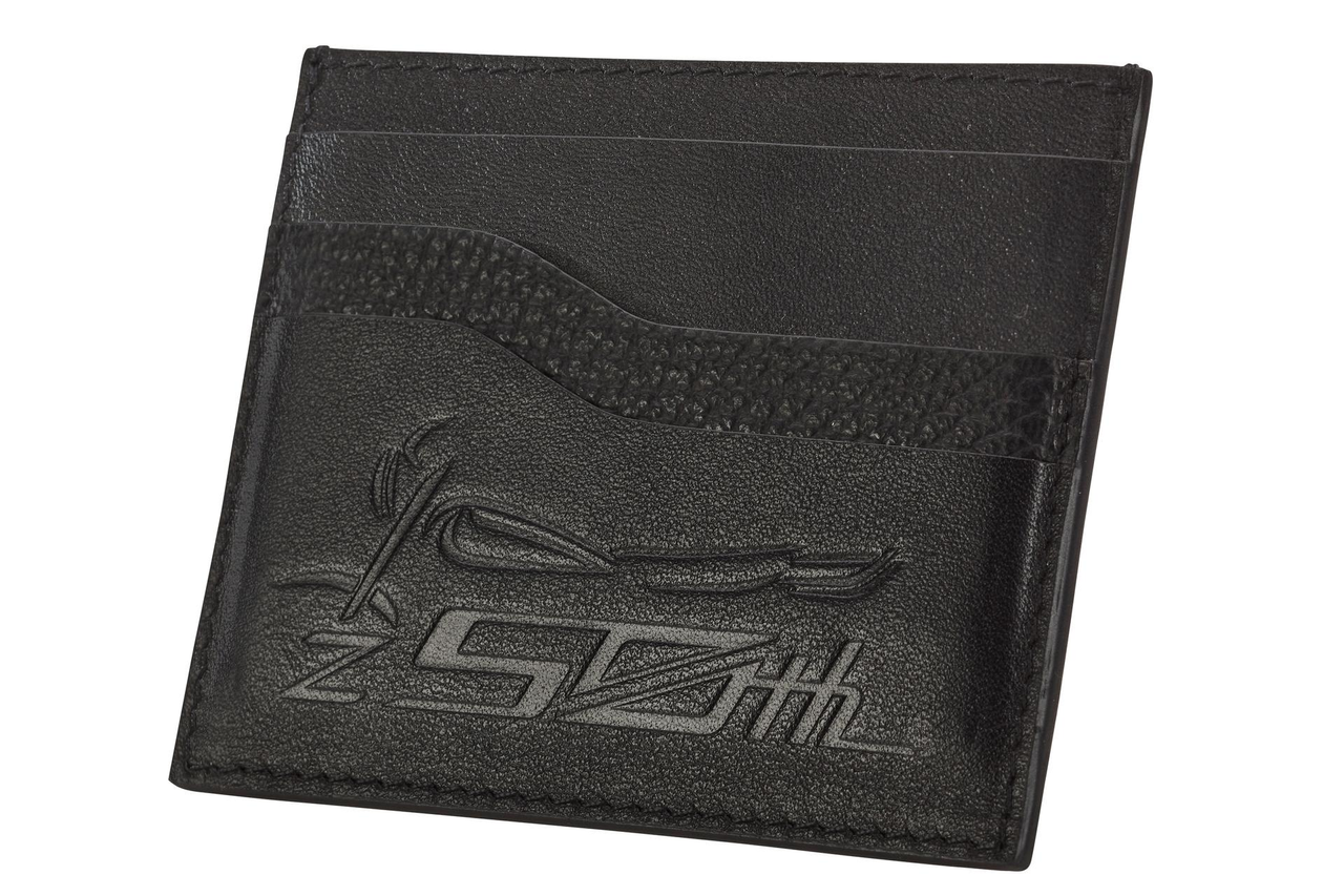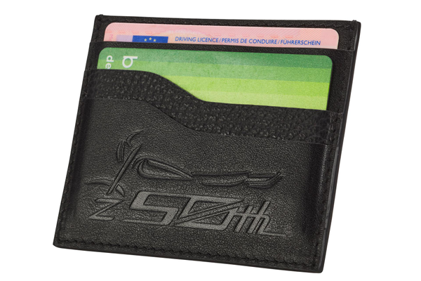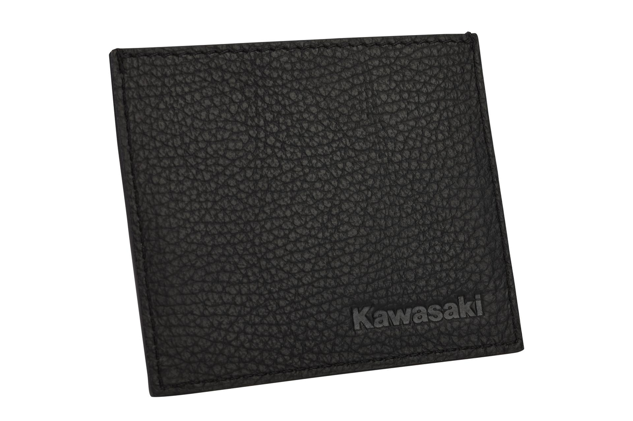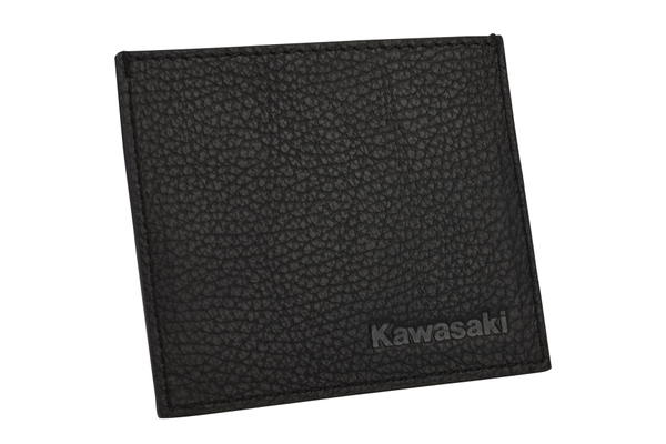 Compacte leren cardholder met vier vakken. Geperst 50th Anniversary-logo vooraan, Kawasaki-logo achteraan. Combinatie van glad en pebbled leer; pebbled achterkant.