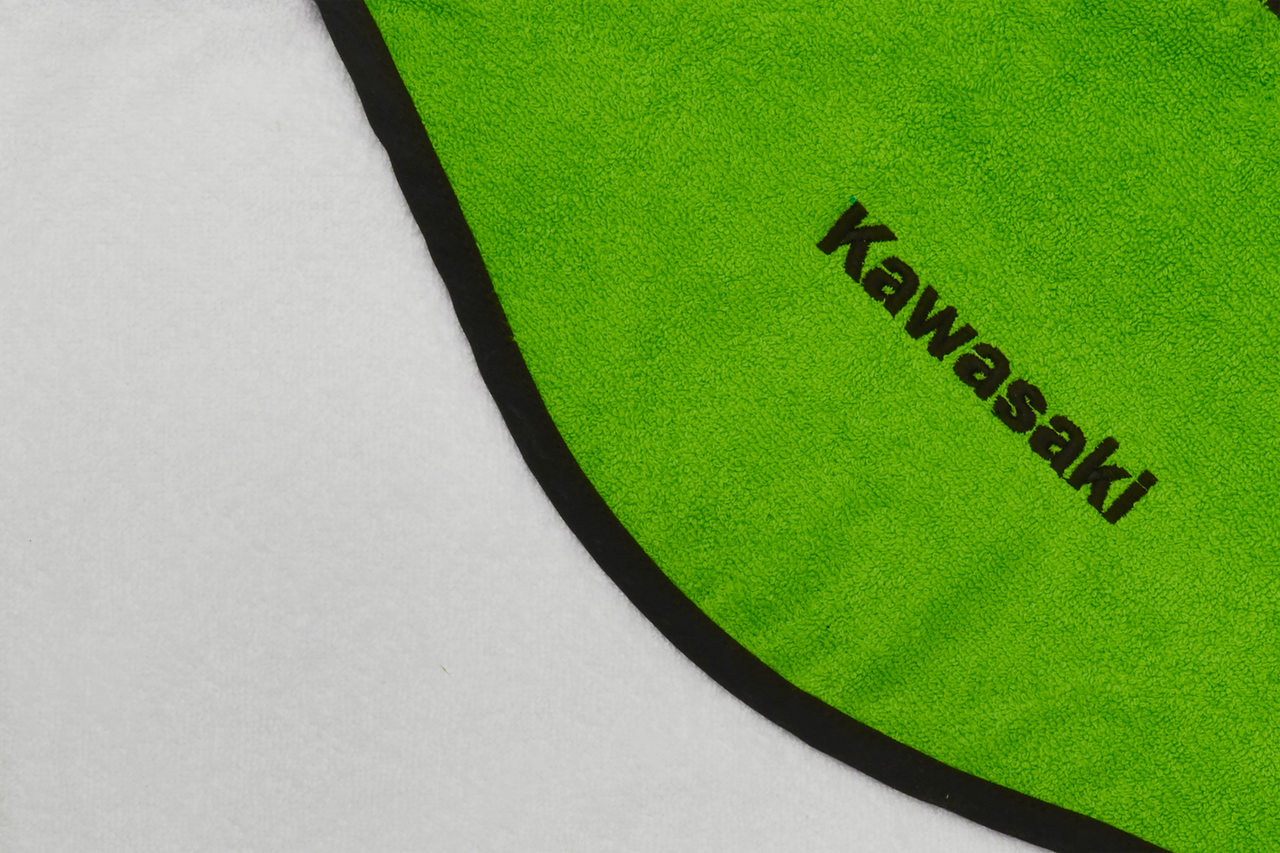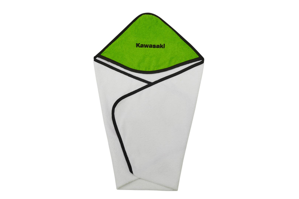 Hooded towel van 100% badstof. Afmetingen 75×75 cm. Witte handdoek met zwarte randafwerking, capuchon in Kawasaki-groen. Voorzien van Kawasaki-logo. One size.