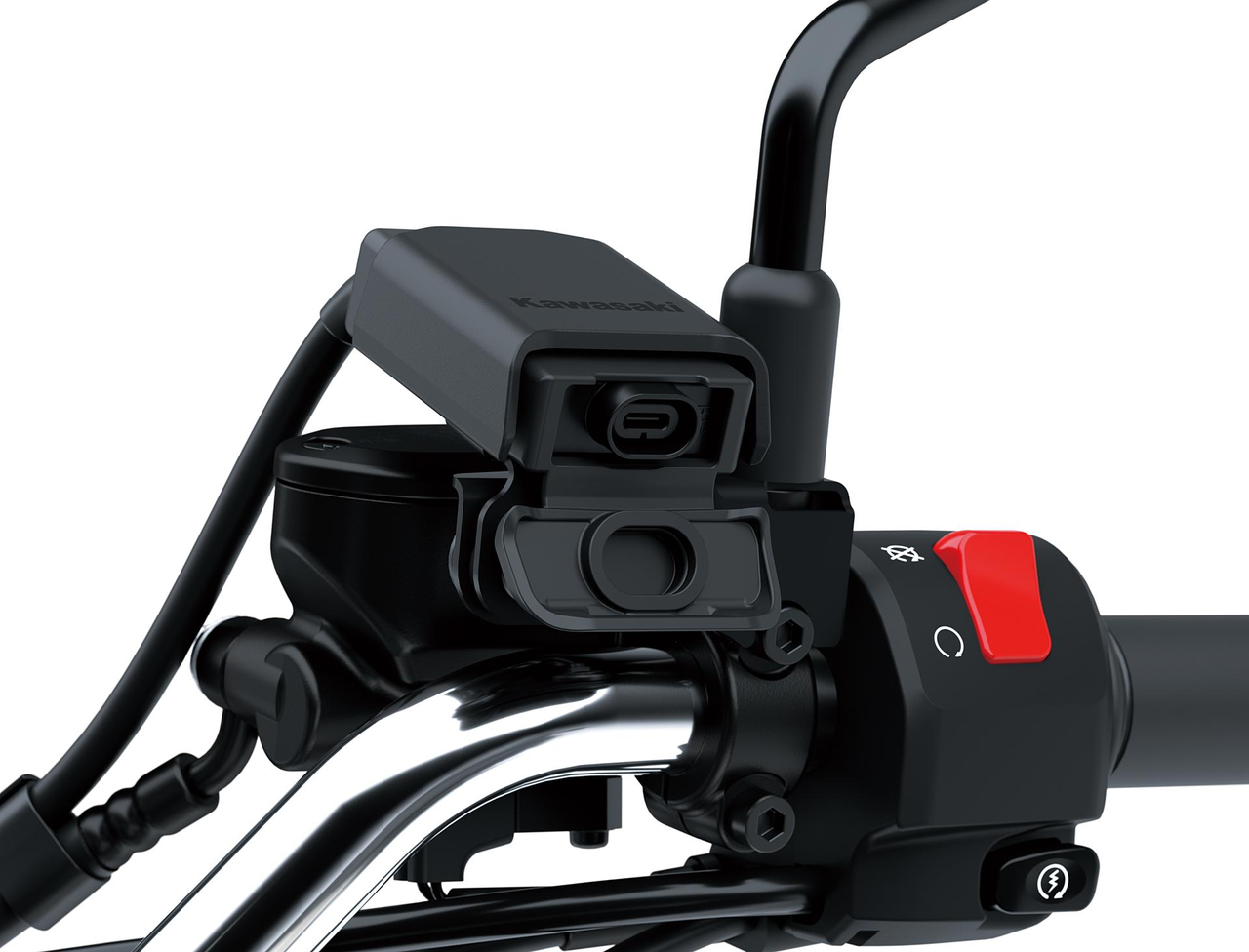 USB-laadkit voor montage op stuur. 12V input, 5V 3A output. Dealerinstallatie aanbevolen.