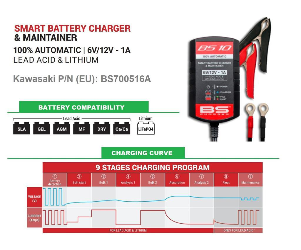 Compacte Kawasaki Smart Battery Charger houdt je accu in topconditie tijdens de winter. Geschikt voor loodzuur-, gel- en Lithium/LiFePo4-accu’s. BS10 (6V/12V, 1A) met 9 laadfases. Vonkvrije verbinding, omgekeerde polariteit-, kortsluit- en oververhittingsbeveiliging. Voor accucapaciteit 2–20Ah. Inclusief klemset, snelkoppeling en EU-stekker. (UK-adapter apart verkrijgbaar.)