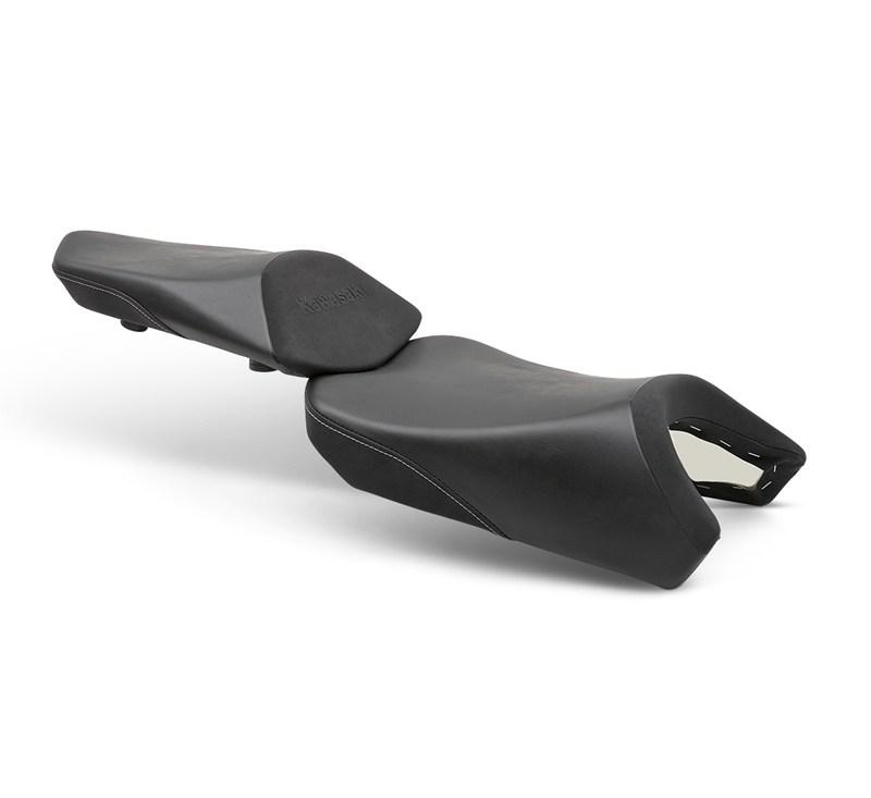 Tweedelig gelzadel voor langdurige ondersteuning en comfort voor rijder en passagier. 15 mm hogere zithoogte voor de rijder, gel-inlays in beide delen, hittewerende bekleding die minder warmte opneemt, contrasterend materiaal en stikwerk met Kawasaki-logo, volledige vervanging van het originele zadel.