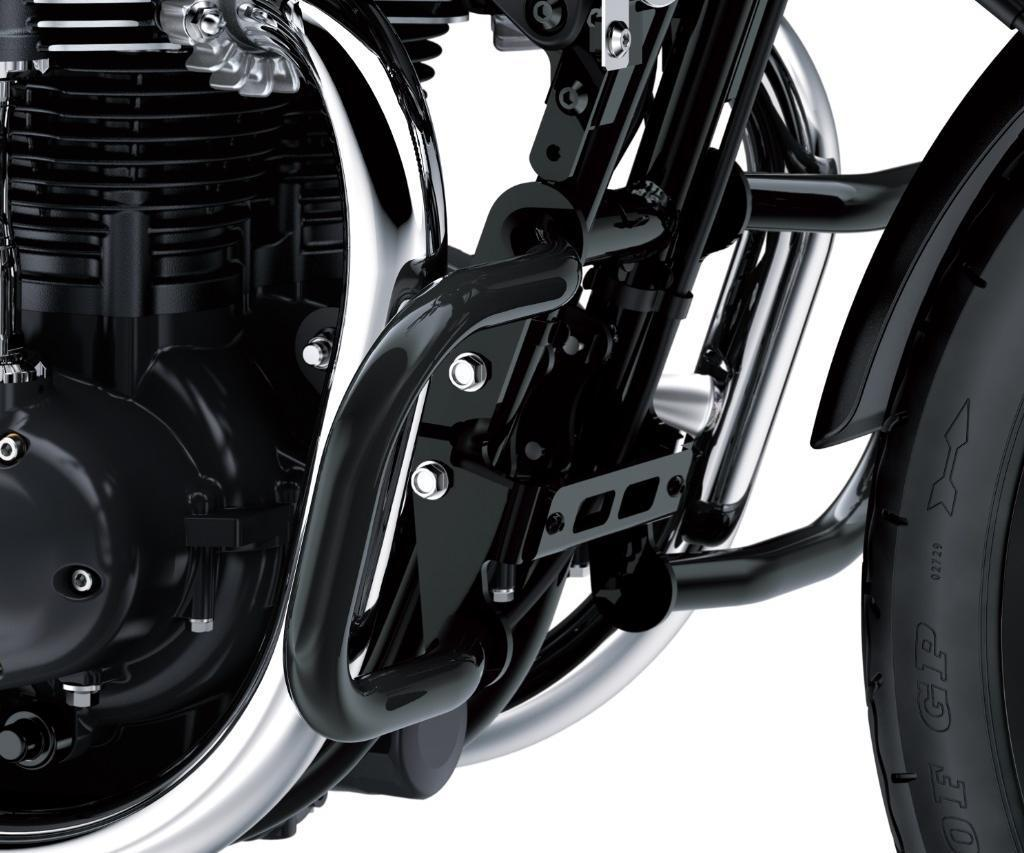 Zwarte motorbeschermers gemaakt van oversized stalen buizen. Inclusief de benodigde beugels en montagematerialen. Let op: biedt alleen beperkte bescherming voor benen en cosmetische delen in specifieke situaties zoals omvallen bij stilstand; niet ontworpen om letsel te voorkomen bij een botsing.