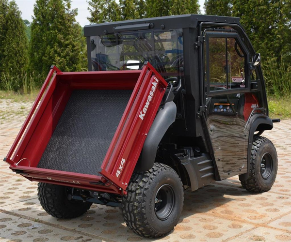 Hard Cabin Kit voor MULE SX (022CAT0087C). Inclusief glazen voorruit, stalen dak, stalen/PC-achterpaneel, PC-deuren met vaste ramen en ruitwisser-/sproeierset. Afgebeeld: versie met schuifruiten.